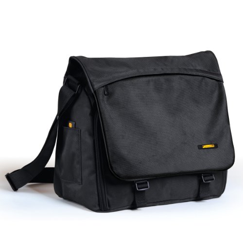 Modern messenger style bag has 4 main compartments and a padded pocket that holds up to a 14 inch laptop, front organizer pockets keep your files, cards and other accessories neat and accessible, additional side pocket for mobile phone, saddle strap secures bag to suitcase handle, extra padded shoulder strap for added comfort, measures (inches): 17 w x 13.75 h x 3.5 d Read more...
